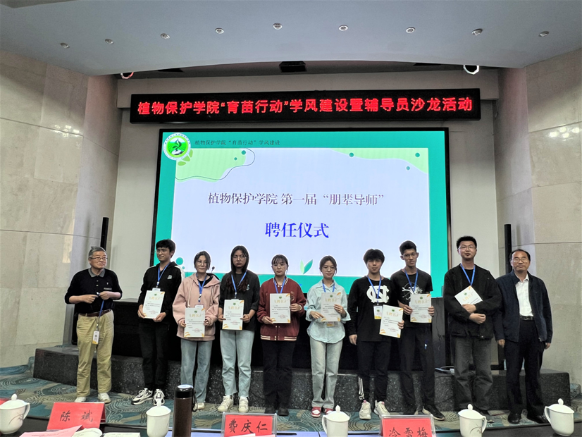 冷雪梅从“一个中心、两个抓手、三个会议”的管理模式分享了班级建设工作经验。植保院学生第四党支部雷志远宣读了学风建设倡议书、2021级植物保护1班的优秀学生代表陈紫媛分享了自己的学习方法。学院成立了首届朋辈导师团,费庆仁和陈斌为朋辈导师团颁发了聘书和工作证,朋辈导师团代表李映萱表示将用自身所学做好“传帮带”,切实帮助学弟学妹在学业中取得进步。