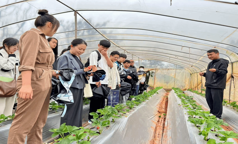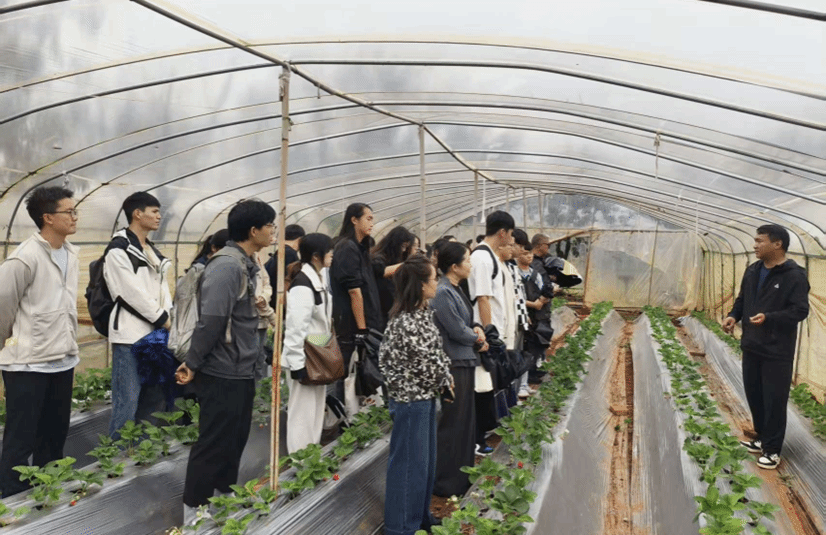 一行人首先走进企业的种植示范基地,上了一堂生动的“田间实践课”。云南骄宇科技专业合作社总经理王鸿宇详细介绍了树莓和草莓从种苗培育、智慧种植、水肥管理、病虫害绿色防控的全链条技术,并展示了其成果深加工成果醋、化妆品等多元化产品的全产业链运营模式,让师生们直观感受到现代农业的科技魅力与市场潜力。在昆明初野农业家庭农场,周津志总经理则分享了其将绿色种植与共享菜园、亲子科普等新业态相结合的成功经验,展现了现代农业的无限可能。这堂“大棚课堂”不仅让学生开阔了眼界,更让他们对所学专业的应用前景有了更深刻的认识。