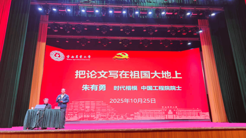 学院特别邀请了“时代楷模”、中国工程院院士朱有勇作《把论文写在祖国大地上》专题报告。报告中,朱院士以个人发展历程为脉络,生动讲述了学农爱农,坚定信念、开拓创新,把论文写在祖国大地上的科研故事。院士 心怀国之大者,深耕科研沃土的感人事迹,让在场新生深刻感受到 把论文写在祖国大地上的使命担当。