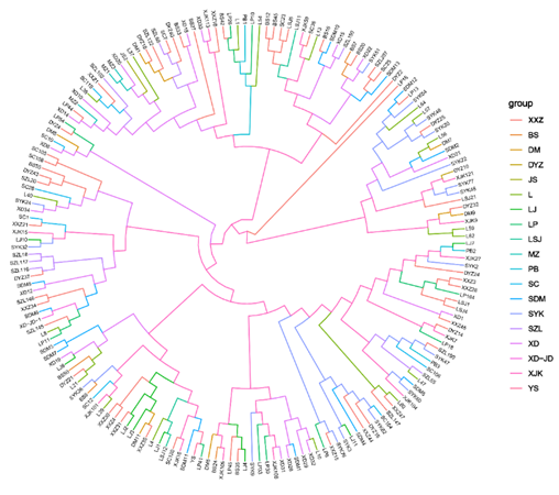 图6 基于遗传相似系数的云南省187株槭菌刺孢菌的聚类分析。不同的颜色表示不同的采样位置。SZL(建水)、BS(泸西)、JS(建水)、MZ(蒙自)、LP(龙朋)和SC(绍冲)为红河分离物。文山产的真菌有YS(燕山)、WS(文山)、LSJ(丘北)、SDM(丘北)、XXZ(丘北)、DM(杜蒙)和PB(文山)。DYZ和SYK为曲靖分离物。XD(寻甸)、XD-JD(寻甸)和XJK(石林)为昆明产的真菌。LJ为丽江分离菌株