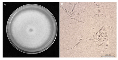图2 槭菌刺孢菌落(A)和分生孢子(B)