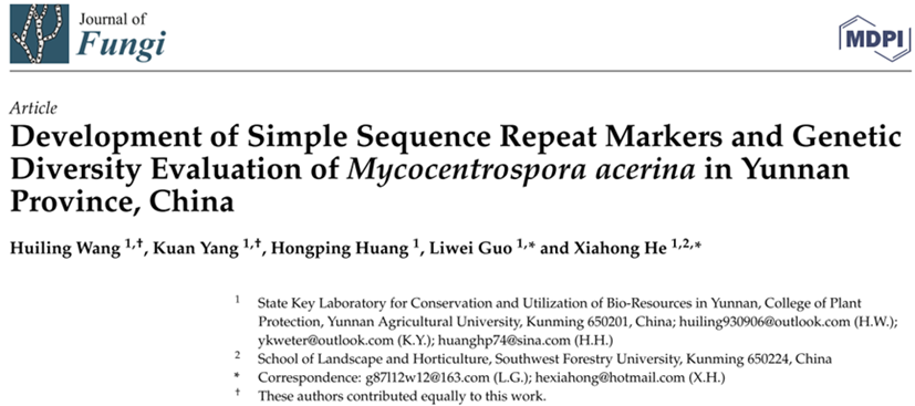 何霞红教授团队在真菌学领域高质量期刊 Journal of Fungi (中国科学院2区,IF=4.7)发表了题为“Development of Simple Sequence Repeat Markers and Genetic Diversity Evaluation of Mycocentrospora acerina in Yunnan Province, China”的研究论文。该论文基于三七圆斑病菌槭菌刺孢M. acerina的基因组信息分析了其SSR序列的分布,并开发出高多态性引物32对,其中14个多态性位点共检测到264个等位基因,遗传多样性为0.813~0.946,群体期望平均杂合度为0.897.