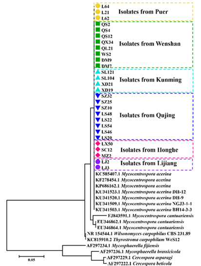 所有地理来源菌株均基于其菌落/分生孢子进行鉴定(图1,2),并根据ITS 1/4序列构建的系统发育树显示,所有分离株均与M. acerina聚为一枝(图3)。