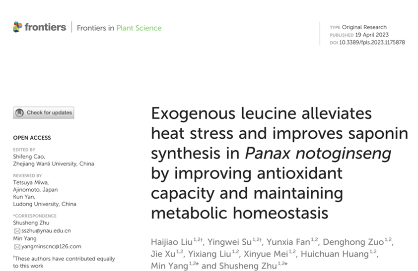 朱书生教授团队题为“Exogenous leucine alleviates heat stress and improves saponin synthesis in Panax notoginseng by improving antioxidant capacity and maintaining metabolic homeostasis”的研究论文。该论文通过盆栽、田间试验和代谢组揭示了外源应用亮氨酸缓解三七热胁迫和促进皂苷合成的效应和机制。