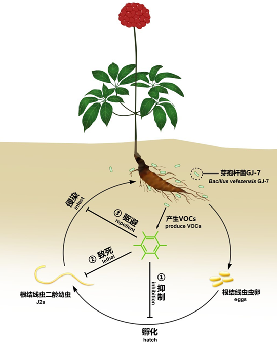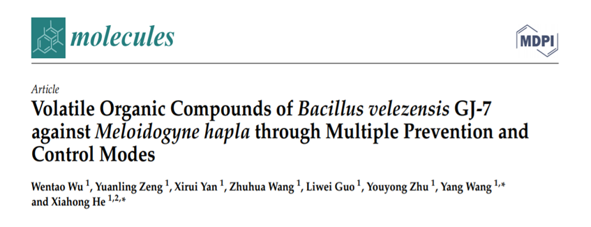 植物线虫研究室题为“Volatile organic compounds of Bacillus velezensis GJ-7 against Meloidogyne hapla through multiple prevention and control modes“的研究论文。该论文的研究结果表明贝莱斯芽孢杆菌GJ-7的挥发性代谢物质可以通过多种途径帮助三七抵抗北方根结线虫的侵染。