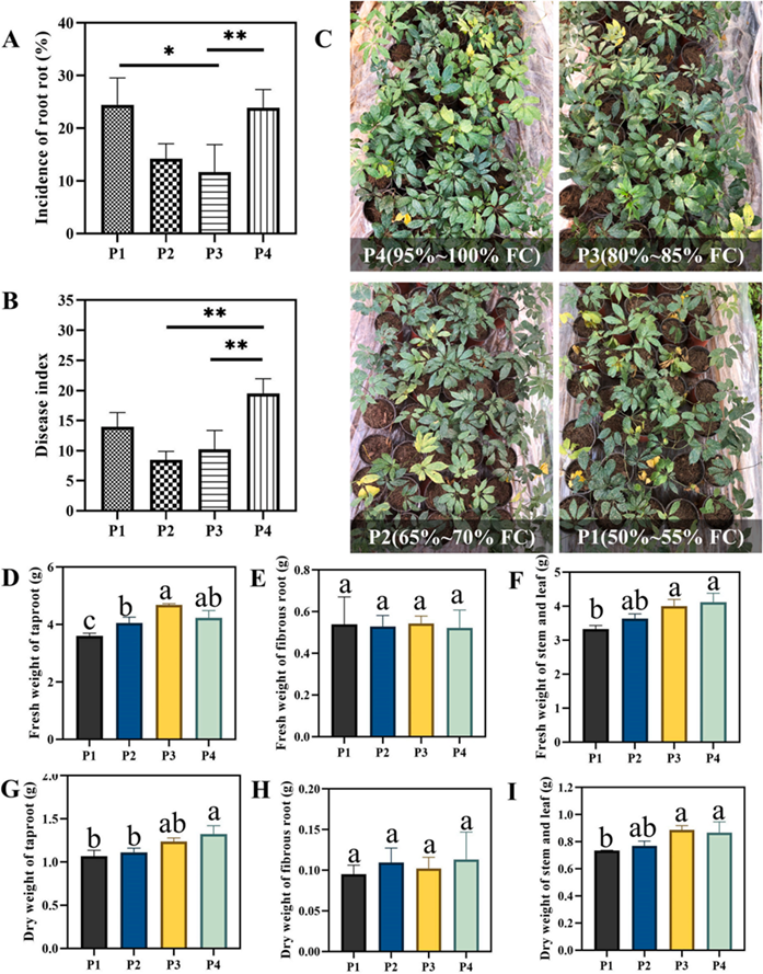 图1不同土壤水分处理对林下三七根腐病发病率、病情指数和生物量的影响