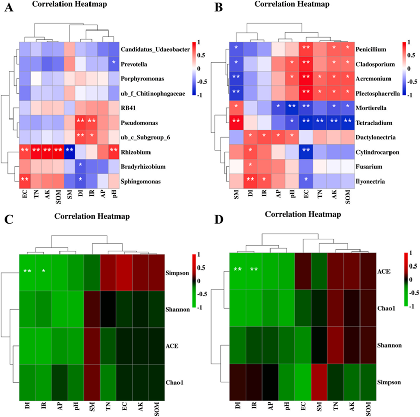 图3 土壤化学性质和三七根腐病的发病情况与林下三七根际微生物群落结构的相关性