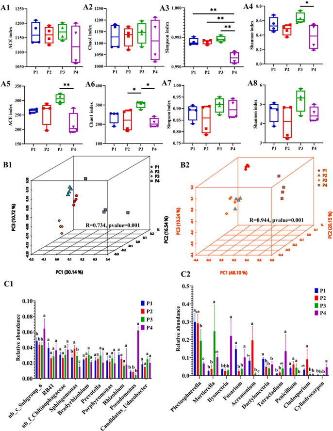 森林生境与三七人工栽培相结合构建的农林复合生态系统是一种创新的三七栽培方式。土壤水分是植物健康生长的关键因素,与植物生物量、次生代谢产物和疾病发生率密切相关。在本研究中,我们利用在不同土壤水分处理下生长的林下三七的生理指标、抗逆性、产量、质量和根腐病发病率,确定了适合林下三七生长的最佳土壤水分。本研究的结果表明,P3处理下的林下三七生长最佳,P1(低土壤水分)和P4(高土壤水分)处理都会加剧林下三七根腐病的发生。利用第三代测序技术用于准确分析林下三七根际土壤微生物群落特征,并确定了与林下三七根腐病相关的微生物群落,进一步的分析表明,高土壤水分会破坏林下三七根际微生物的多样性,导致三七根腐病病原菌的增值,从而导致三七根腐病的严重发生。综上所述,较低水平(P1和P2)的土壤水分会影响林下三七的产量和质量,而无限供水(P4)则会增加林下三七根腐病的发病率,综合分析林下三七的产量、质量和根腐病发生率,P3(80–85% FC)处理是确保林下三七健康生长的最佳土壤水分。本研究的试验结果有助于指导林下三七建立科学的灌溉制度,这不仅有利于节约水资源,更有助于促进林下三七产业的可持续发展。