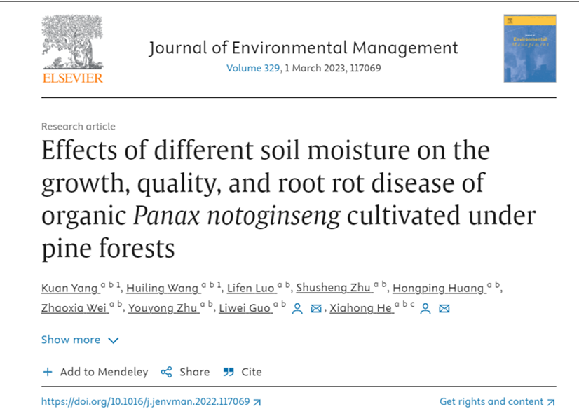 何霞红教授团队在环境领域1区Top期刊Journal of Environmental Management(IF=8.7)上在线发表了题为 “Effects of different soil moisture on the growth, quality, and root rot disease of organic Panax notoginseng cultivated under pine forests” 的研究论文。该论文揭示了林下三七的需水特性及土壤水分与根腐病的发生规律。