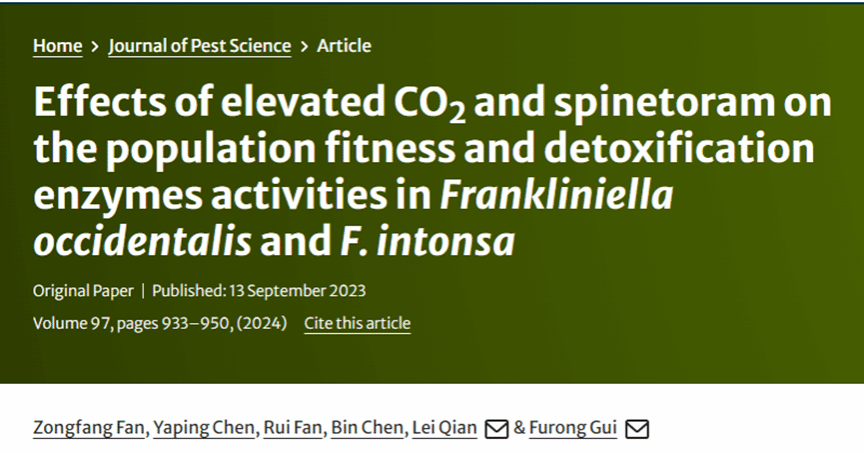 2023年9月,团队还在农林科学1区TOP期刊Journal of Pest Science(IF=4.8)发表了题为“Effects of CO2 elevated and spinetoram on the population fitness and detoxification enzymes activities in Frankliniella occidentalis and F. intonsa”的研究论文,发现大气二氧化碳浓度升高提高了入侵害虫西花蓟马对乙基多杀菌素的抗性发展速度,也加速了其对本地种花蓟马的种群替代。