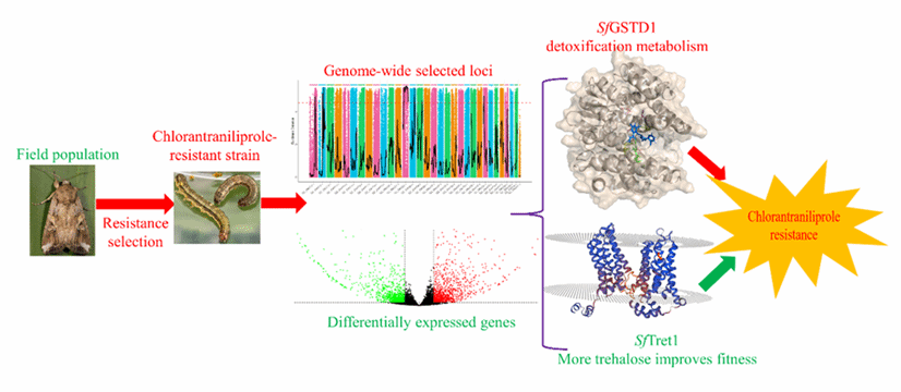 本研究基于团队前期构建的染色体级别的草地贪夜蛾基因组(Gui et al., Protein & Cell, 2022, IF=21.1),利用基因组重测序和转录组测序鉴定出氯虫苯甲酰胺抗药性种群中的靶标基因,通过RNAi、蛋白建模等阐明了草地贪夜蛾通过谷胱甘肽S转移酶GSTD1解毒代谢氯虫苯甲酰胺和通过海藻糖转运蛋白提高胞内海藻糖含量适应农药胁迫的分子机制。
