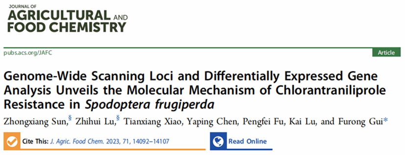 2023年9月,团队在农林科学1区TOP期刊Journal of Agricultural and Food Chemistry(IF=6.1)发表了题为“Genome-wide scanning loci and differentially expressed genes analysis unveils the molecular mechanism of chlorantraniliprole resistance in Spodoptera frugiperda”的研究论文,基于基因组重测序解析了入侵害虫草地贪夜蛾对氯虫苯甲酰胺的抗药性机制。