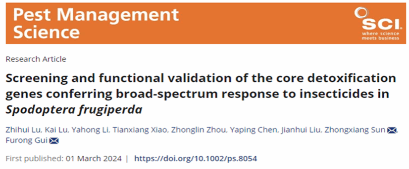 此外,团队在学校各级领导的关心支持下,近期在生物入侵领域发表了一系列的研究成果。2024年3月18日,团队在农林科学1区TOP期刊Pest Management Science(IF=4.462)在线发表了题为“Screening and functional validation of the core detoxification genes conferring broad-spectrum response to insecticides in Spodoptera frugiperda”的研究论文,基于交叉转录组研究鉴定出重大入侵害虫草地贪夜蛾广谱响应8种不同类型杀虫剂的核心解毒酶基因,为鉴定新的杀虫靶标防控该害虫提供了重要基因资源。