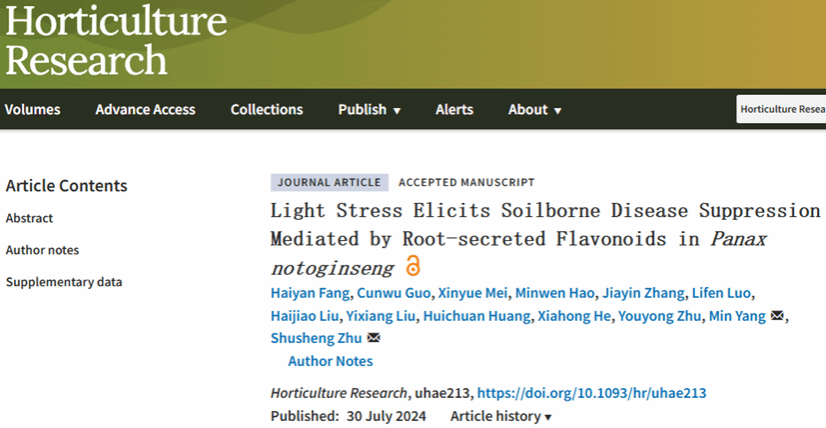 朱书生教授团队农林科学1区Top期刊Horticulture Research(IF=7.6)在线发表了题为 “Light Stress Elicits Soilborne Disease Suppression Mediated by Root-secreted Flavonoids in Panax notoginseng” 的研究论文。