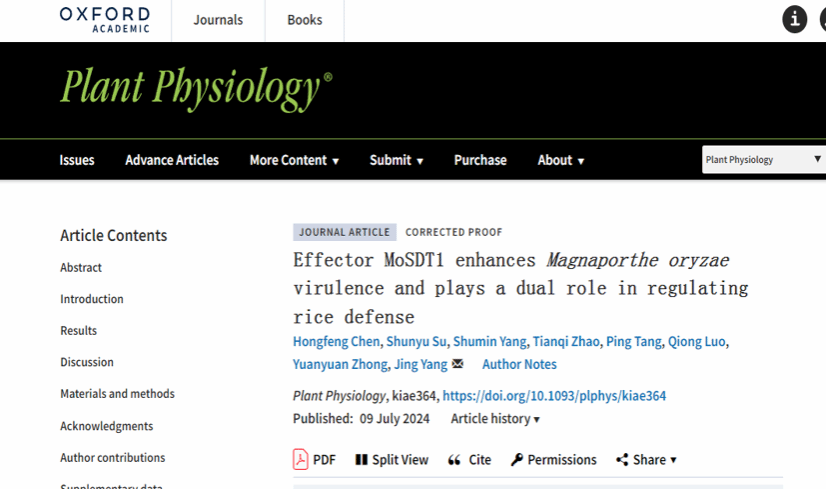 作物抗病遗传与病原致病机制团队在Plant Physiology(JCR Q1 TOP IF6.8)发表重要研究成果。该团队围绕植物与病原菌互作机制开展相关研究,该研究基于稻瘟菌效应蛋白MoSDT1在稻瘟菌毒性和水稻防御中发挥着看似矛盾作用的机制解析,揭示了MoSDT1是稻瘟菌毒性所必需的,MoSDT1在水稻防御响应中发挥不同的调控作用,取决于它进入水稻细胞的方式。