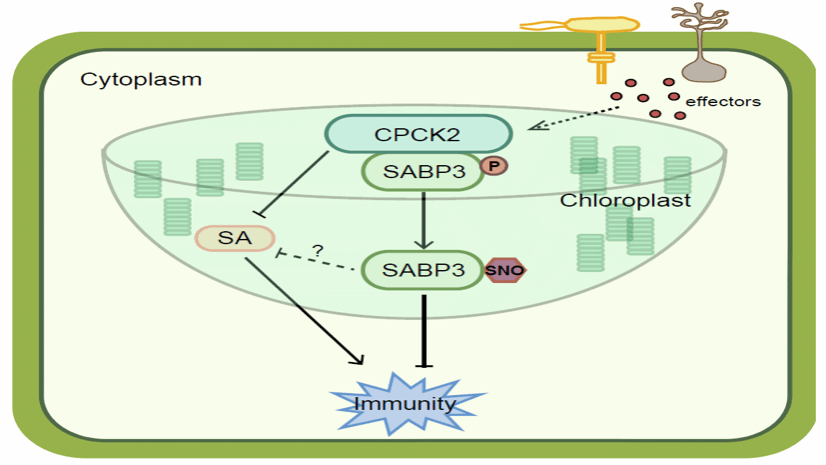 越来越多的研究表明叶绿体不仅仅是光合作用的场所,其在植物免疫反应中也发挥着重要作用。本研究发现叶绿体定位的酪蛋白激酶II (CK2)复合体α亚基CPCK2的编码基因突变后植物体内抗性激素水杨酸(salicylic acid , SA)含量明显增高,植物对病原菌的抗性显著增强,表明CPCK2是植物免疫的负调控因子。进一步研究证明CPCK2与水杨酸结合蛋白(SA-binding protein 3, SABP3)相互作用并磷酸化SABP3,促进其S-亚硝基化,降低其活性和对水杨酸的亲和力,从而抑制SABP3在抗病反应中的功能。综上,该研究揭示了叶绿体定位的CPCK2蛋白负调控植物免疫的分子机制,进一步证明了叶绿体在植物抗病反应中具有重要功能。