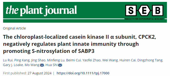 827日,我校色情卡通 抗病遗传与病原致病机制研究团队时华/王莫课题组在植物科学一区Top期刊《Plant Journal(IF5=7.1)上在线发表了题为The chloroplast-localized casein kinase II α subunit, CPCK2, negatively regulates plant innate immunity through promoting S-nitrosylation of SABP3”的研究论文。该研究发现了一个叶绿体定位的植物免疫负调控因子CPCK2,通过磷酸化调控水杨酸结合蛋白SABP3S-亚硝基化,从而负调控植物免疫反应的新机制。该研究在植物中首次报道了磷酸化修饰能够促进蛋白S-亚硝基化水平。