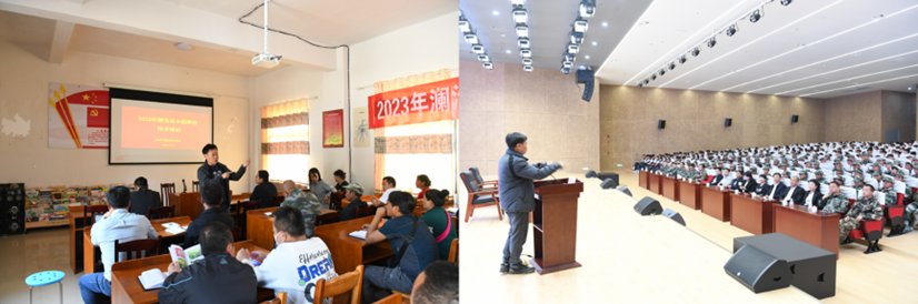 培训开始前,中国工程院朱有勇院士作了开班动员,结合澜沧县经济发展状况介绍了举办本次培训班的目的、水稻旱作的技术。团队文建成教授、汤东生副教授、杜广祖副教授和蔡红教授分别从水稻旱作种植、除草、防虫、控病四个方面进行专题授课。在蒿枝坝村,培训还深入田间地头,实地为参训人员演示种植技术。本次培训共发放“水稻旱作种植技术手册”112份。在澜沧期间,朱有勇院士还与各级领导班子进行座谈交流,安排部署了2023年澜沧县竹塘乡1万亩水稻旱作核心示范区和1.5万亩辐射带动区的水稻旱作土地、种子和除草剂、播种机等筹备工作。