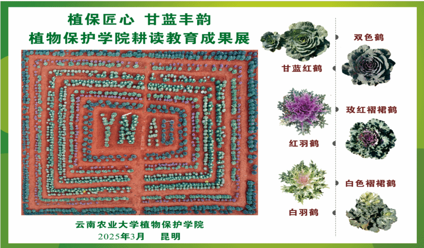 以“植保匠心,甘蓝丰韵”为主题,在学院耕读教育实践基地举办了《劳动实践》课程成果展。2023级植保三班同学在专业教师指导下,历时6个月,完成了从土地翻耕、理墒,到育苗、移栽及大田管理等园艺栽培全流程,更通过科学合理的绿色植保技术,打造出零农药残留的羽衣甘蓝生态景观园区。