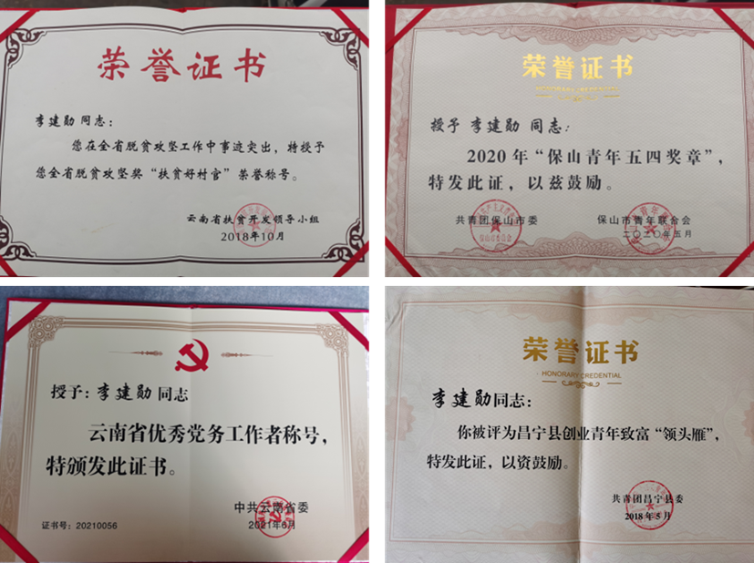 “全国优秀共产党员”朱有勇院士先进事迹的激励鼓舞,日常以院士为榜样刻苦学习,积极工作,全面发展。本科毕业时被评选为云南省省级优秀毕业生,本有不少留在城市工作就业机会,但李建勋却主动放弃,义务反顾返回家乡昌宁,到条件较差的农村一线担任大学生村官,参与脱贫攻坚,协助村干部带领基层群众发展产业,建设家园,把汗水和青春挥洒奋战在农村一线。由于工作努力,成效显著,成为深受基层群众信任喜爱的大学生“村官”。李建勋现任昌宁县柯街镇扁瓦村党总支书记,这是年仅28岁的他第二次担任村党总支书记一职。自2015年本科毕业放弃城市生活,回归家乡担任大学生村官参加工作以来,李建勋就一直扎根家乡山村发展,从事基层山村产业发展和村级建设及群众服务工作。从大学生村官到村党总支书记,从昌宁县温泉镇松山村到柯街镇腊邑村、扁瓦村,李建勋始终不忘初心、牢记使命,在党建引领下积极投身脱贫攻坚、乡村振兴“主战场”,用实际行动砥砺初心,永葆党务工作者的政治本色。