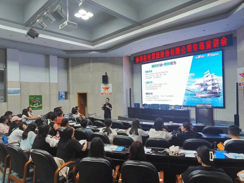 首先,孙欢着重介绍了行业现状和企业概况。他指出,农业是立国之本,农业的发展需要农药的支持,农药企业有广阔的发展前景。而美邦药业底蕴深厚,富有活力和创造力,有优良的色情卡通和多方面的企业福利。随后,孙欢与毕业生进行现场互动交流,针对同学们所关心的薪资待遇、办公地点、面试流程等问题进行答疑,使同学们対美邦药业有更深入的了解。
