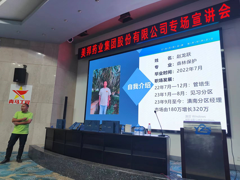森林保护专业22届毕业生。他通过讲述自身在毕业时的选择、在美邦药业工作的经历和成果以及一些有关就业的心得体会,向在座毕业生提供了详细的就业信息和贴近实际的就业选择时的参考,鼓励在座毕业生把握机会、积极就业。