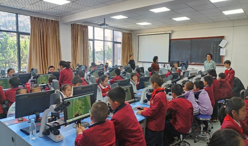 小学生们还到了博学楼实验室,观看昆虫科普视频,学习“蚜虫-瓢虫-蚂蚁”之间的食物链关系等。他们热情高涨、好奇满满,与实验室吴道慧老师、刘旭燕老师积极互动,现场气氛热烈,效果良好。