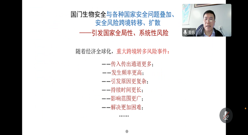 《动植物检验检疫法规》课程特邀中国检验检疫科学研究院首席科学家朱水芳研究员为2021级本科生解读《中华人民共和国生物安全法》、《生物多样性公约》及《安全议定书》方面内容,授课在逸夫楼C区303及305线上互动教室开展。