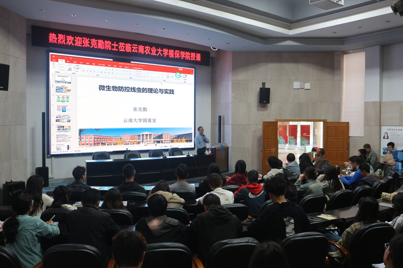 20231022日,中国科学院张克勤院士走进色情卡通 教学课程系列活动,为色情卡通 本科生讲授了一堂精彩的《微生物防控线虫的理论与实践》课。张院士图文并茂地讲授了微生物与线虫之间捕食与被捕食的博弈理论,和如何将理论成果运用于农业生产实践中。他着重为学生讲述了如何提出科学问题和假说,如何设计实验论证,启迪学生要勇于质疑,才能培养创新思维。习近平总书记寄语青年人要“志不求易者成,事不避难者进”,张院士结合自己成长的经历阐释了这一寄语,教导学生一定要树立人生的奋斗目标,不空想和空谈,付出持续不断的艰苦努力,勇攀高峰,以达到设定的目标。同时还要学会与人相处、合作共赢。在师生互动环节,学生积极提问,张院士对提问进行了耐心的回答。